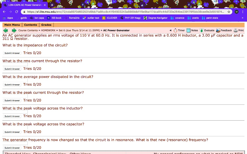LON-CAPA AC Power Generato X https://s1.lite.msu.edu/enc/72/cda8970d602531d9bb71a8fcc8c41f94903243a8869dbf1f9e9ba117dca91c44d720e264be239179f5bb38cee9e2d551874… Apps gphib lon capa PB ISS book Rome2rio outlier test ICLICKER PHY 231 Nagy Degree Navigatorii covance ii zoetisi penn state Main Menu Contents Grades Course Contents >> HOMEWORK >> Set 6 (due Thurs 3/14 at 11:59PM) >> AC Power Generator ?Timer Notes Evaluate Feedback Print An AC generator supplies an rms voltage of 110 V at 60.0 Hz. It is connected in series with a 0.600 H inductor, a 3.00 µF capacitor and a 311