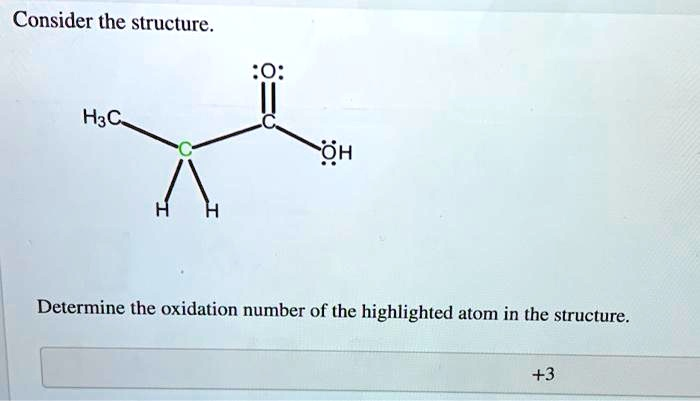 Consider the structure. H3C OH Determine the oxidation number of the highlighted atom in the structure. +3