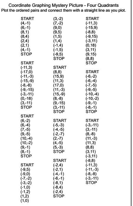 Coordinate Graphing Mystery Picture Four Quadrants Plot the ordered pairs and connect them with straight line as you plot START START (-11_ (-15, STOP START (-11,31 (17,0) STOP START START (-6 -18) STOP STOP STOP START START START STOP STO START START STOP STOP