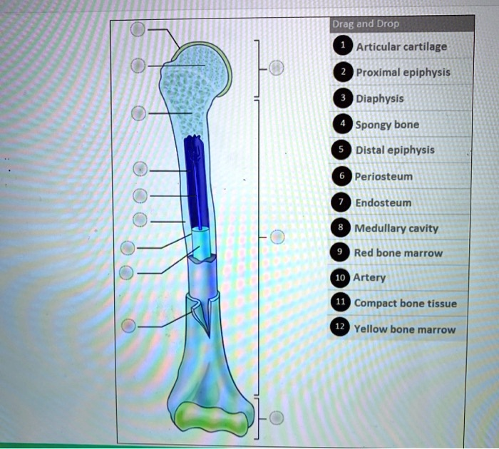 Drag and Drop 1 Articular cartilage 2 Proximal epiphysis 3 Diaphysis 4 Spongy bone 5 Distal epiphysis 6 Periosteum 7 Endosteum 8 Medullary cavity 9 Red bone marrow 10 Artery 11 Compact bone tissue 12 Yellow bone marrow