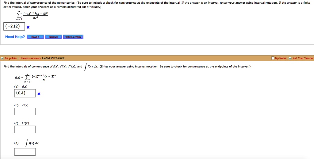 - At x=4: The series is Σ [(-1)^(n+1)(2)^(n+1)] / (n(n+1)2^n) = Σ 2(-1)^(n+1)/(n(n+1)). This series converges absolutely (as shown for x=0), so it converges.
