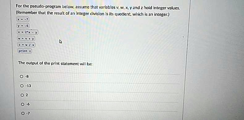 For the pseudo-program below, assume that variables v, w, x, y and z hold integer values. (Remember that the result of an integer division is its quotient, which is an integer.) x <- 7 y <- 6 v <- 2*x – y w <- v + y z <- w / x print z The output of the print statement will be: -8 -13 2 -6 -7