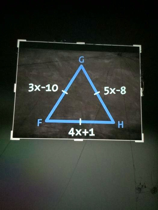 - If we set side FG equal to side FH, the equation is 3x – 10 = 4x + 1. Subtracting 3x from both sides gives -10 = x + 1. Subtracting 1 from both sides, we find that x = -11.