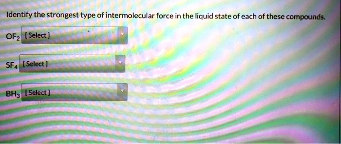 Identify the strongest type of intermolecular force in the liquid state of each of these compounds: OF2 Select ] SF4 Select ] BH3 Select ]