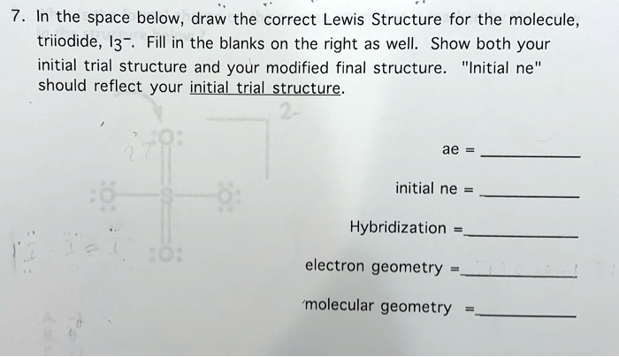 In the space below, draw the correct Lewis Structure for the molecule, triiodide, I3-. Fill in the blanks on the right as well: Show both your initial trial structure and your modified final structure: Initial ne should reflect your initial trial structure: ae initial ne Hybridization electron geometry molecular geometry