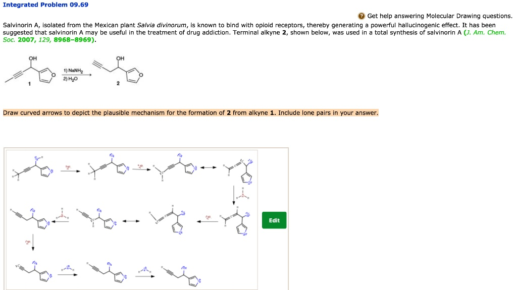 Integrated Problem 09.69 Get help answering Molecular Drawing questions. Salvinorin, isolated from the Mexican plant Salvia divinorum, is known to bind with opioid receptors, thereby generating a powerful hallucinogenic effect. It has been suggested that salvinorin may be useful in the treatment of drug addiction. Termina Ikyne, shown below, was used in the total synthesis of salvinorin (J Am Chem Soc, 2007, 129, 8968-8969). 1) NeNkz 2Hzo Draw curved arrows to depict the plausible mechanism for the formation of Ikyne from NeNkz. Include lone pairs in your answer.