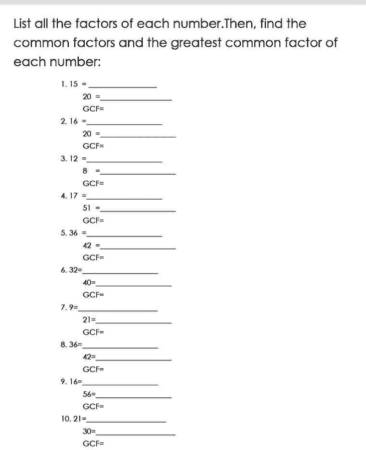 List all the factors of each number. Then, find the common factors and the greatest common factor of each number: 1. 15 = 20 = GCF= 2. 16 = 20 = GCF= 3. 12 8 GCF= 4. 17 = 51 = GCF= 5. 36 = 42 = GCF= 6. 32= 40= GCF= 7. 9= 21= GCF= 8. 36= 42= GCF= 9. 16= 56= GCF= 10. 21= 30= GCF=without using the em dashes,PROVIDE the correct answer and 300 words explanation