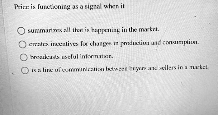 Price is functioning as a signal when it summarizes all that is happening in the market. creates incentives for changes in production and consumption. broadcasts useful information. is a line of communication between buyers and sellers in a market.