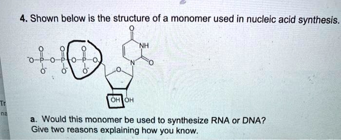 Shown below is the structure of a monomer used in nucleic acid synthesis_ OH OH Would this monomer be used to synthesize RNA or DNA? Give two reasons explaining how you know.