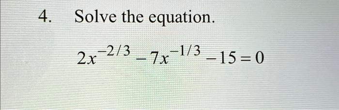 2x−23−7x−13−15=02x^{-\frac{2}{3}} – 7x^{-\frac{1}{3}} – 15 = 0