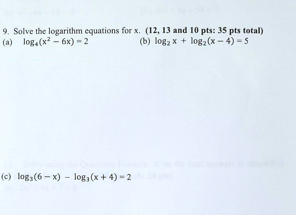c) log₃(6 – x) – log₃(x + 4) = 2