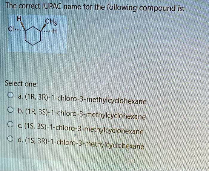 The correct IUPAC name for the following compound is: (IR; 3R)-1-chloro-3-methylcyclohexane.