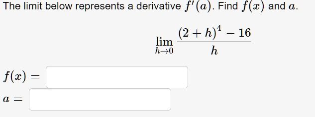 This limit thus represents the derivative of f(x)=x4f(x) = x^4 evaluated at x=2x = 2, which is f′(2)=4×3=32f'(2) = 4x^3 = 32, though the question only asks for f(x)f(x) and aa.
