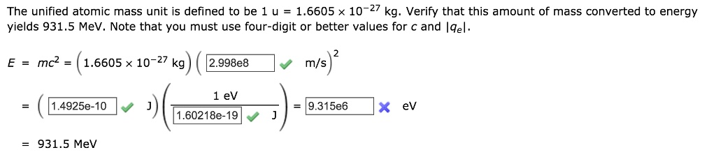 The problem requires verifying the energy equivalence of one unified atomic mass unit (u), which is stated to be 931.5 Mega-electron-volts (MeV). This verification process is based on Albert Einstein’s famous⁻¹⁹ J/eV)