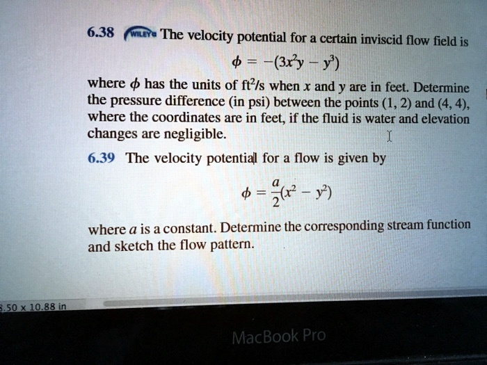 /s when x and y are in feet. Determine the pressure difference (in psi) between the points (1, 2) and (4, 4), where the coordinates are in feet, if the fluid is water and elevation changes are negligible. 6.39 The velocity potential for a flow is given by