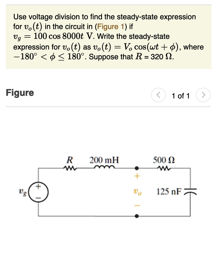 In this circuit, we are given the input voltage vg(t)=100cos(8000t) Vv_g(t) = 100 \cos(8000t) \, Vvg(t)=100cos(8000t)V, and we need to use voltage division to find the steady-state output voltage vo(t)v_o(t)vo(t) in the form: vo(t)=Vocos(ωt+ϕ)v_o(t) = V_o \cos(\omega t + \phi)vo(t)=Vocos(ωt+ϕ)