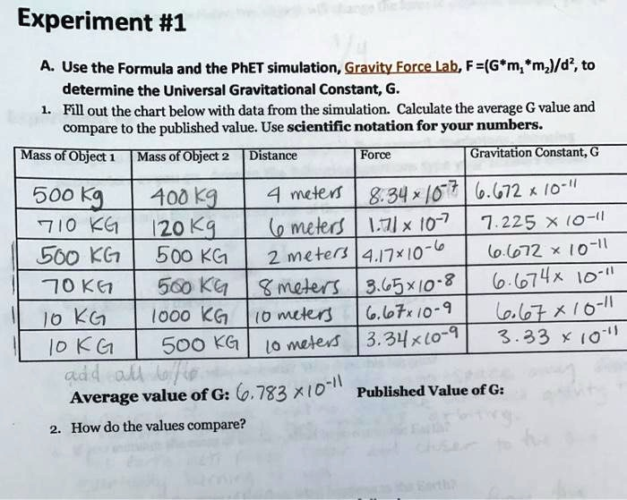 Using the Formula and the PhET simulation, Gravity Force Lab; F=(Gm1m2)/d^2, to determine the Universal Gravitational Constant. Fill out the chart below with data from the simulation. Calculate the average G value and compare it to the published value. Use scientific notation for your numbers: Mass of Object 1 Mass of Object 2 Distance Force Gravitational Constant; G 4 meters 2.34 x 10^6 Kg 7.0 x 10^12 Kg 12.0 meters 7.225 x 10^-11 N 5.60 x 10^12 Kg 5.00 x 10^12 Kg 2 meters 4.17 x 10^-6 N 6.672 x 10^-11 N 70 Kg 5.00 x 10^12 Kg 3.65 x 10^-7 N 6.74 x 10^-11 N 10 Kg 1000 Kg 0.10 meters 3.34 x 10^-9 N 3.33 x 10^-11 N Average value of G: 6.783 x 10^-11 Published Value of G: [Insert published value here] How do the values compare