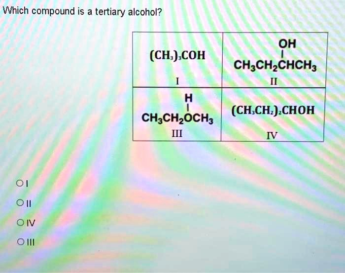 Which compound is a tertiary alcohol? OH (CH3)3COH CH3CH2CHCH3 H (CH3CH2)3CHOH CH3CH2OCH3 MI 01 oil Oil III
