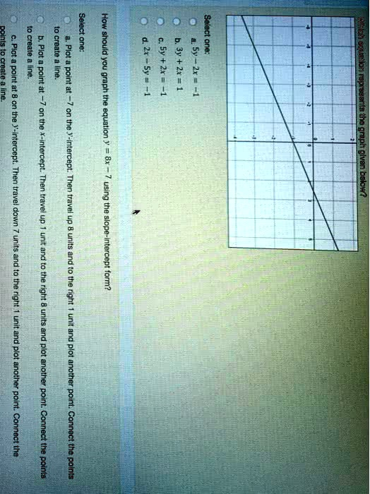Which equation represents the graph given below? Select one: a. 5y – 2x = -1 b. 3y + 2x = 1 c. 5y + 2x = -1 d. 2x – 5y = -1 How should you graph the equation y = 8x – 7 using the slope-intercept form? Select one: a. Plot a point at 7 on the y-intercept. Then travel up 8 units and to the right 1 unit and plot another point. Connect the points to create a line. b. Plot a point at -7 on the x-intercept. Then travel up 1 unit and to the right 8 units and plot another point. Connect the points to create a line. c. Plot a point at 8 on the y-intercept. Then travel down 7 units and to the right 1 unit and plot another point. Connect the points to create a line
