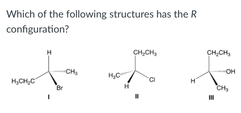 To determine which structure has the R configuration, we will follow the Cahn-Ingold-Prelog priority rules. These rules involve the assignment of priorities to the substituents attached to the chiral center based on atomic number and other criteria. After determining the priorities, we will arrange the substituents in the correct order and determine if the configuration is R or S.