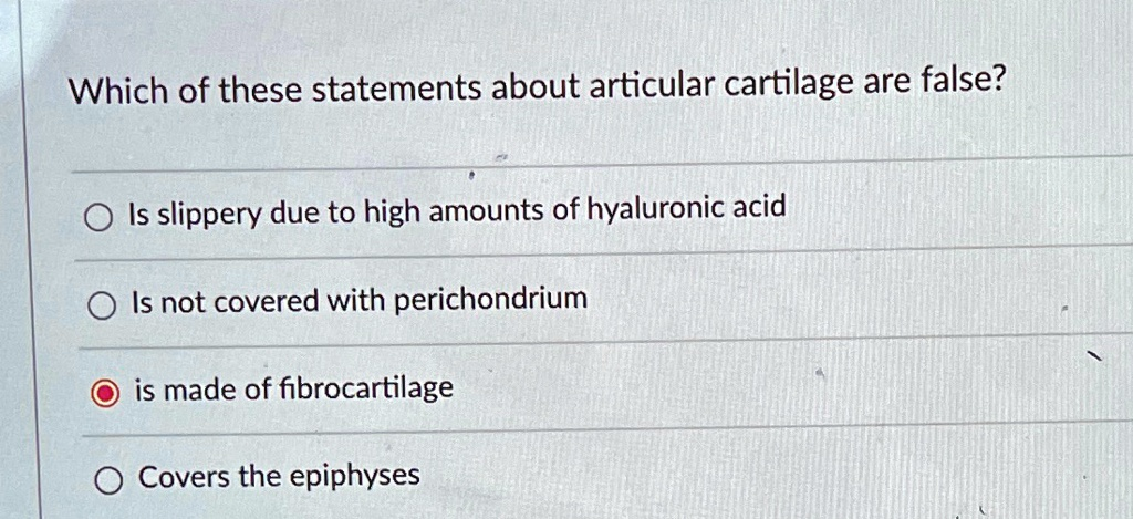 Which of these statements about articular cartilage are false? Is slippery due to high amounts of hyaluronic acid Is not covered with perichondrium is made of fibrocartilage Covers the epiphyses