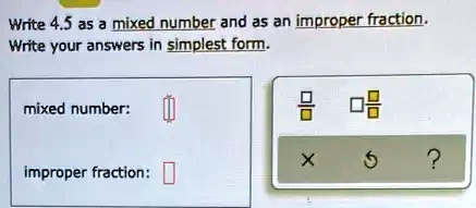 Write 4.5 as a mixed number and as an improper fraction. Write your answers in simplest form. mixed number: improper fraction: